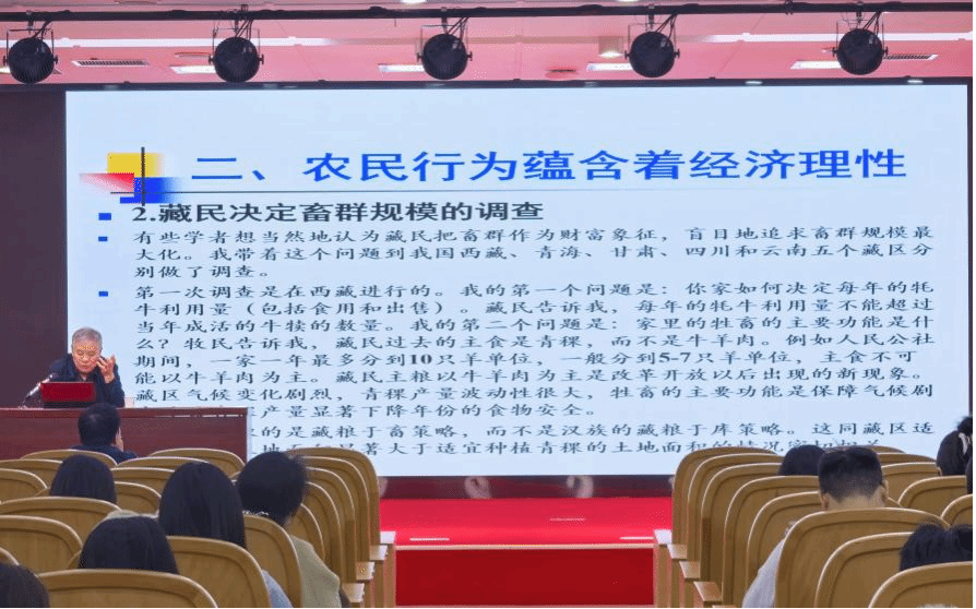 10月28日上午,“林宽讲堂”专题学术报告在安农九华山路校区综合楼三楼报告厅举行,报告由副院长李坦主持,院长杨波及学院100余名师生参加。报告中,李周以 “农民行为中的经济学理性 —— 田野调查中的收获”为题,结合自身长期扎根中国农村的田野调查实践,系统阐释了农民行为中的经济学逻辑。他指出,理解“三农”问题的关键在于深入分析农民在现实约束条件下的理性选择过程,必须从农民实际行为出发,把握乡村社会的运行机制。他强调,传统经济学中的理性假设应当在具体的乡村社会语境中加以修正与再解释;田野调查不仅是获取数据的手段,更是发现新问题、提出新理论的重要途径。最后,他以西藏、青海、甘肃、四川和云南等地的调研为例,揭示了农民行为中所蕴含的经济理性机制与深层逻辑。