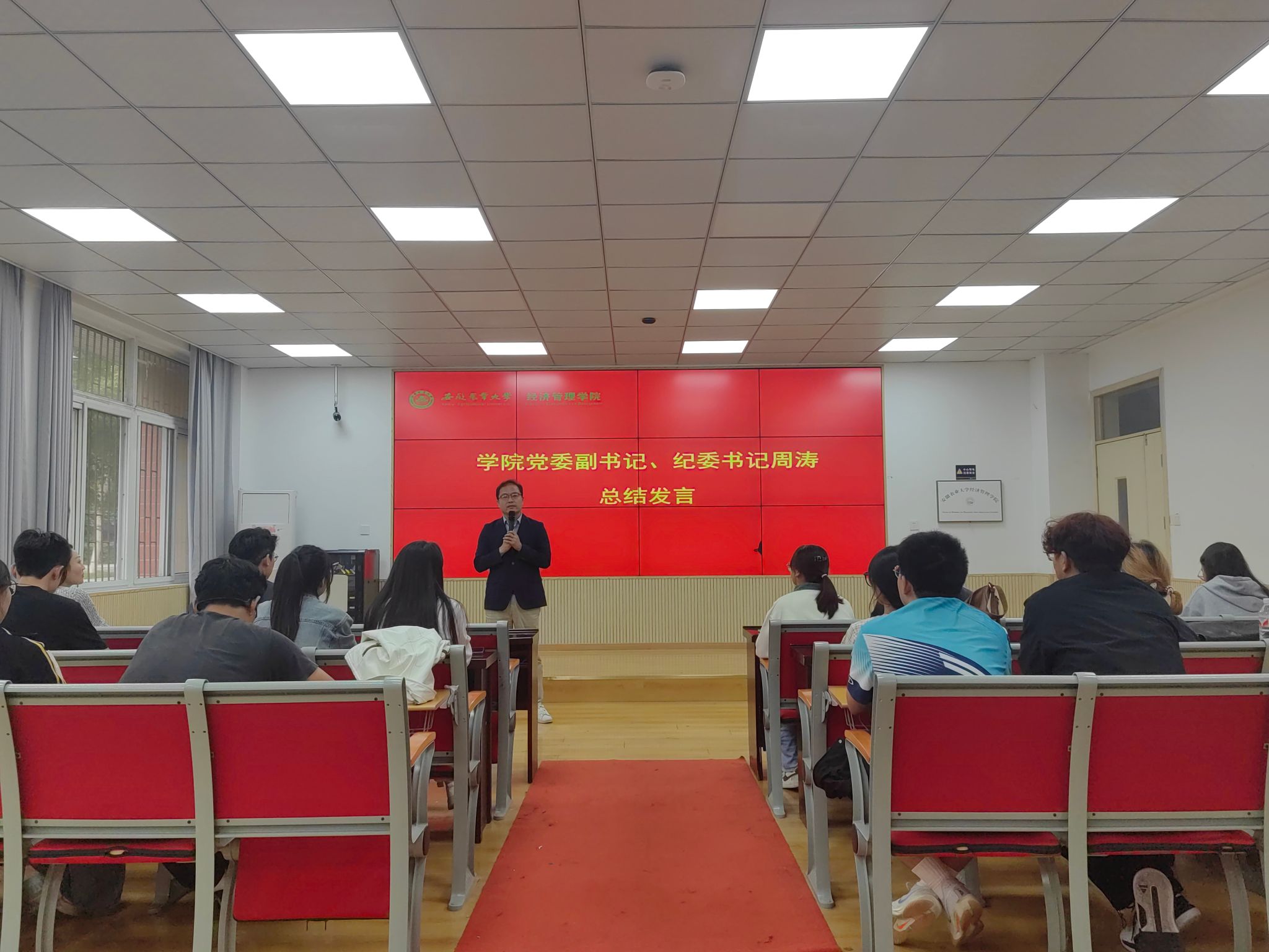 会上,团学负责老师对学院第五十八届田径运动会参赛情况进行了总结,分析了学院的优势项目和短板,鼓励参赛运动员保持优势、补齐短板,并从注意训练安全、遵守比赛规则、保持良好心态方面对运动员进行叮嘱。学生会体育部主要负责人介绍了第五十九届田径运动会的备赛情况,从体测组织、人员安排、物资保障等前期工作以及后期训练计划等方面分别进行了说明,动员大家携手努力、共创佳绩。随后,通过播放优秀运动员宣传片、邀请老生运动员代表分享参赛感受等,以他们的亲身经历勉励运动员以最积极的态度和良好的心态对待训练、对待运动会,发挥出自己的最佳水平。最后,周涛进行总结讲话,他肯定了学院历届运动会上成绩的延续和精神的传承,并指出运动会是传承和弘扬中华体育精神的重要载体,参加运动会是提升个人综合能力的有效方式,更是人生难得的体验,希望大家能够以发展的眼光对待运动会,磨炼自己的意志品质,养成良好的生活和运动习惯。