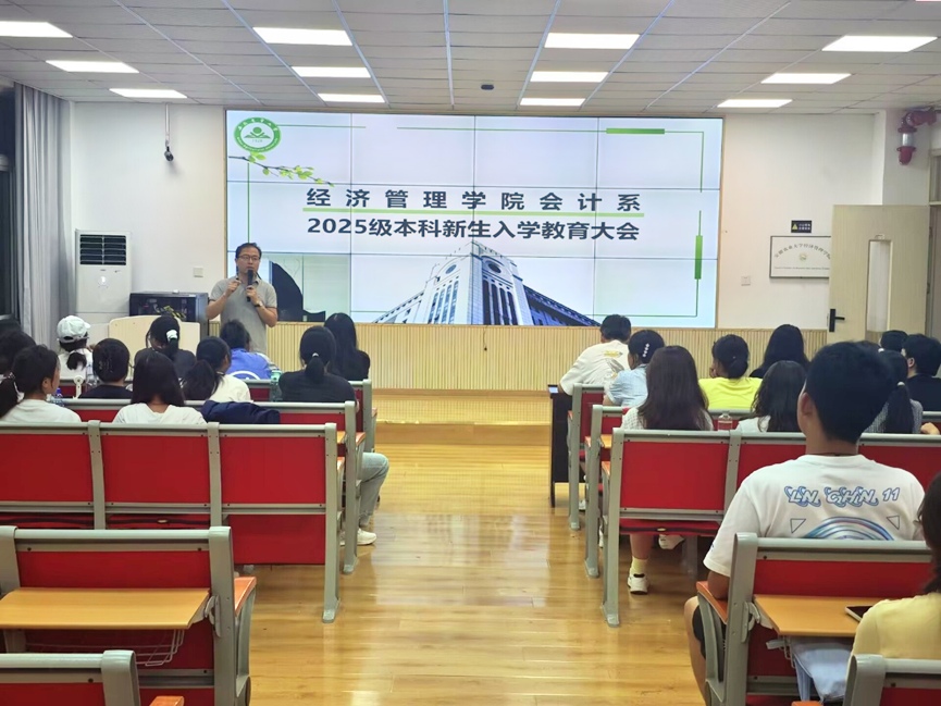本网讯 9月16日,会计系在经管楼103教室举行2025级本科新生入学教育大会。学院党委副书记、纪委书记周涛,班主任沈洁,教师代表王君仪,辅导员葛伦伟出席会议。会议由会计系主任胡翠萍主持,会计系120名新生齐聚一堂,开启了大学阶段的新征程。