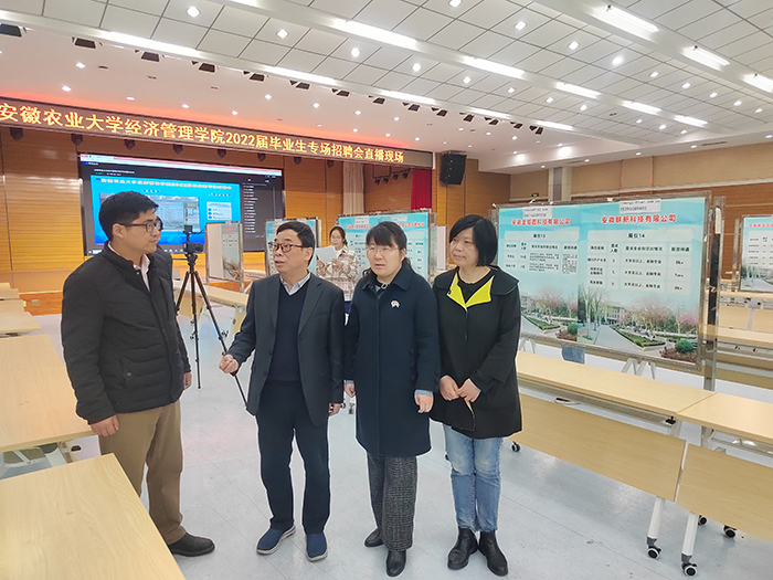 本网讯 为认真贯彻落实党中央、国务院关于“稳就业”“保就业”工作任务部署,做好疫情防控常态化条件下的校园招聘工作,稳步提升就业质量。3月10日,经济管理学院2022届毕业生“云直播”专场招聘会在欣苑食堂四楼大学生活动中心如期举行。校招生就业处副处长沈兆梅,学院党政领导莅临直播现场。