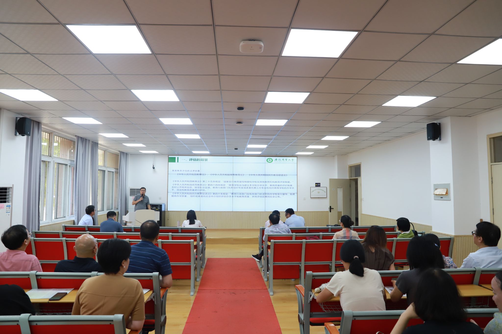 教务处副处长徐峰以《聚力推进本科教育教学审核评估 加快本科人才培养高质量发展》为题,从“评估的背景、新一轮本科教育教学审核评估特点和变化、背景意义组织实施、审核评估实施情况、线上与入校主要工作”五个方面和学院全体教师作了深刻阐释,进一步明确了工作要求。他表示,全体教师要在“一根本、两突出、三强化、五个度”的工作目标指引下,统一思想认识、确定评估方案、搭建组织机构、落实评建任务、划分评估阶段、开展自评自建,以评估思想理念引导改革,以评估要点指标推动改革,以评估政策资源支持改革,全方位、高质量做好本科教育教学审核评估相关工作落实。