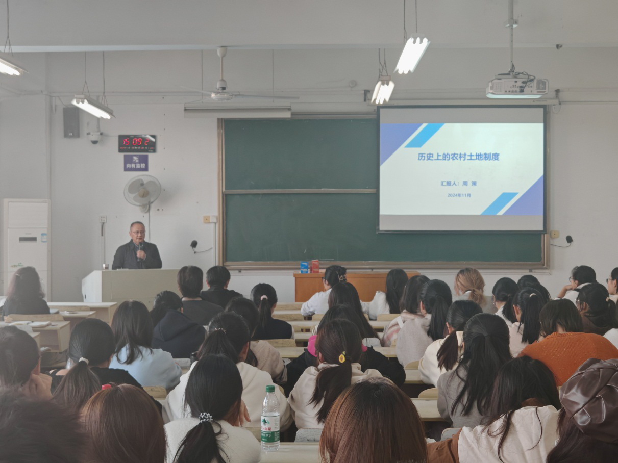 周策从土地制度变迁的视角,向同学们详细生动地讲述了中国历史上不同时期的农村土地制度类型及其特征,并指出土地制度在推动经济的发展、促进政治社会稳定中始终起着至关重要的作用,土地制度变迁给后人留下许多丰富的历史经验。周策处长对中国历史农地制度变迁的深入解读不仅让2024级农林经济管理同学系统了解了中国历史上土地制度概况,也让在场的每位学生都深受启发,同学们纷纷表示从历史的视角看农村土地问题很有意思,明白了只有知历史、懂历史才能更好地开拓创新,讲座进一步提升了他们对农林经济管理专业学习的兴趣,更加期待未来四年的专业学习之旅。(文/图/梅莹 编辑/胡正飞 预审/魏晓飞 审核/田涛)