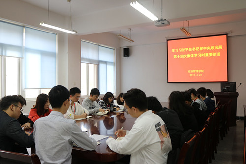 本网讯 在五四运动100周年即将到来之际,为引导青年大学生传承五四精神,4月22日中午,学院组织学院主要学生干部,在经管楼304会议室专题学习习近平总书记在中央政治局第十四次集体学习上的重要讲话精神,会议由学院团委老师主持。