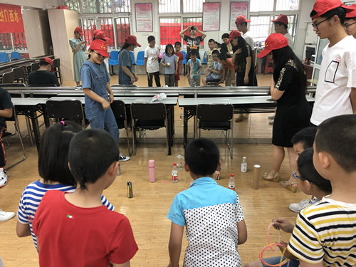 时钟指向下午两点半,特色活动正式开始!首先志愿者们带领小朋友们进行热身游戏“童年的旋律”,让小朋友们唱响童年美丽动听的儿歌,在一首首儿歌中感受到小朋友们的单纯与美好。接着志愿者老师们提前准备的给童年加点“蜜”就开始了,房间里各个地方一共放了十个糖果,小朋友们在规定的时间里找出糖果,糖果的香甜在小朋友们的童年里染上了斑斓的一笔。小朋友们咀嚼着奶香味的糖果的同时,“烦恼像泡泡,解决就忘掉”活动也开始了,小朋友们分成两组,每组所有小朋友依次吹泡泡水,来回运输泡泡,一个个被运送的泡泡就像小朋友们的烦恼,吹走了也就解决了,小朋友的童年是快乐幸福的。最后志愿者老师带领小朋友们进行“幸福的圈圈”活动,让小朋友们进行套圈,每套中一个就可以拿一个奖品,小朋友们都开心着欢呼的进行游戏。