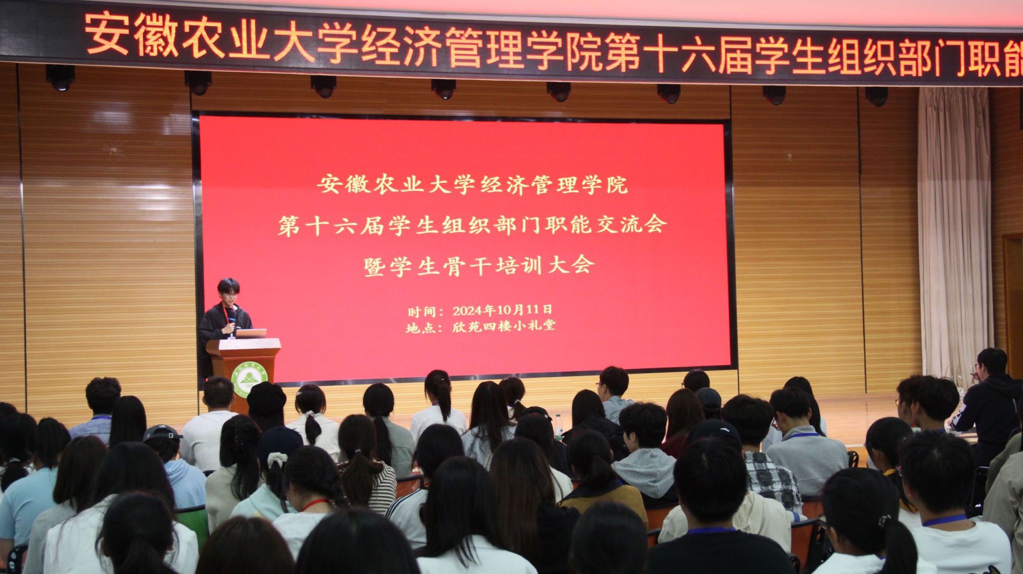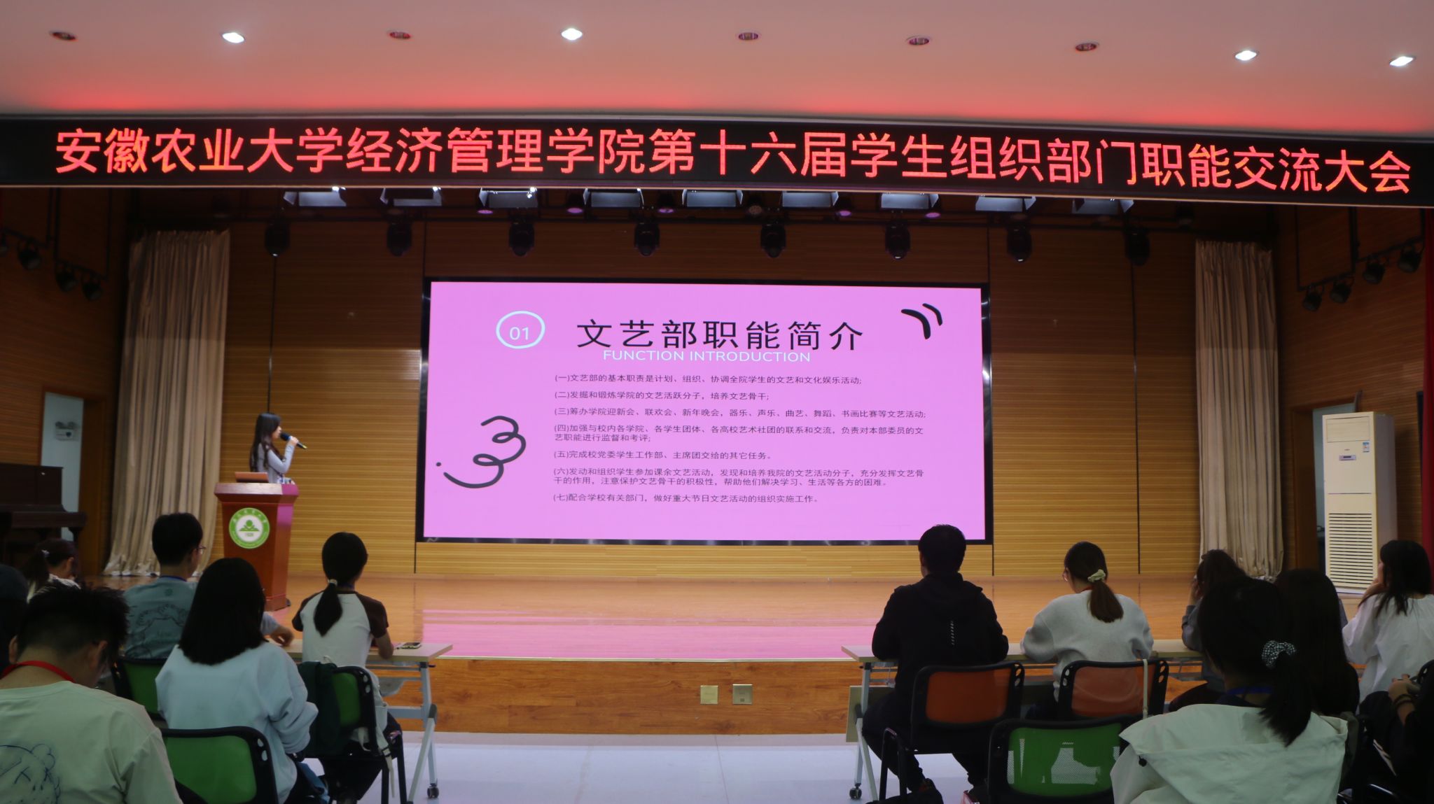 会议伊始,学生会办公室、学生会权益部、学生会文艺部、学生会学践部、禾悦心理工作中心、第二课堂活动中心、青年志愿服务中心、团学基础工作中心、融媒体中心等9部门主要负责人依次上台进行交流发言。他们从部门简介开始,系统介绍了各部门的人员构成、工作职能等基本情况,重点强调了各部门日常工作开展的要求和注意事项,并对各部门未来工作开展进行了展望,此外,还从物资采购、影像拍摄、活动申报和新闻稿撰写等必备工作技能方面对学生骨干进行了培训。随后,学生会执行主席从工作态度、工作纪律和工作方法三方面对学生组织全体成员进行了讲解培训,希望能够不断提升学生骨干的工作能力和综合素质。