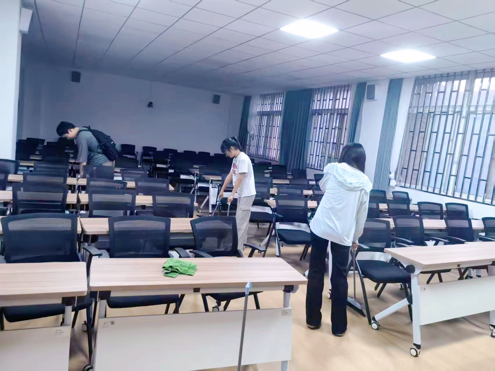 5月7日和9日,学生干部们手持扫帚、抹布、垃圾钳等工具,分组对经管楼教室、走廊、楼梯间、会议室等重点区域展开“地毯式”清洁。经管楼划分为若干网格,由各学生组织认领维护。活动聚焦经管楼公共区域环境提升,通过集体劳动强化学生干部服务意识,以实践行动为师生打造整洁、温馨的学习生活空间,助力校园文明建设。
