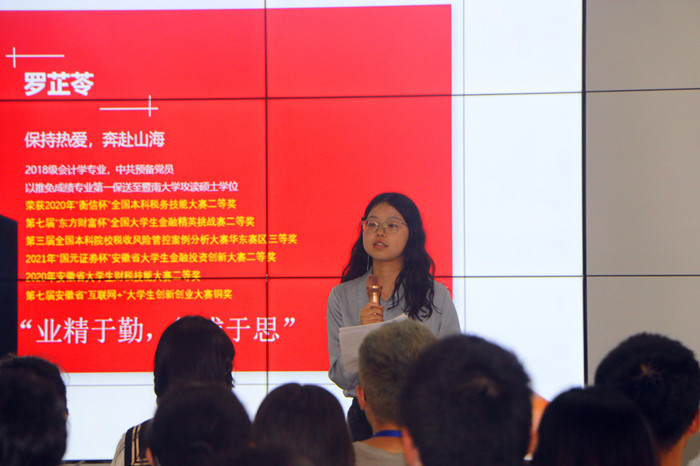 第二位分享的是2018级会计学专业的罗芷苓,罗芷苓同学多次获得专业特等奖学金、校“三好学生”、校“优秀共青团干”、校“优秀学生干部”等多项荣誉,以推免成绩专业第一保送至暨南大学。她在报告会中与同学分享了她在大学四年中充实且有趣的生活,在班级、学生会和团队中不断学习充实自己,告诉同学们要珍惜大学的时光,这是青春最好的时光。同时,她还分享了自己在准备许多学科竞赛的经历,曾率领团队奋战到凌晨三点,与多所高校的佼佼者同台竞争也不退缩,给了同学们许多竞赛的经验。罗芷苓同学还与同学们分享了自己缓解压力的小方法,给了同学们许多启发。