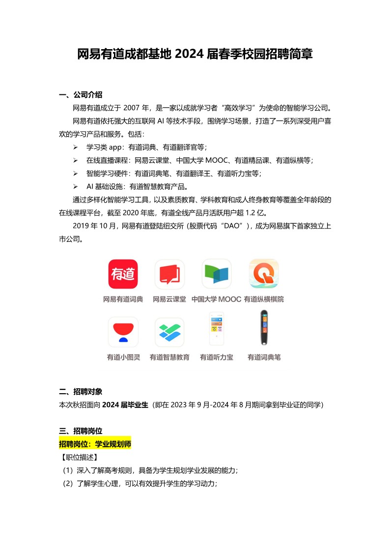 【网易有道】成都基地学业规划师24届春招信息