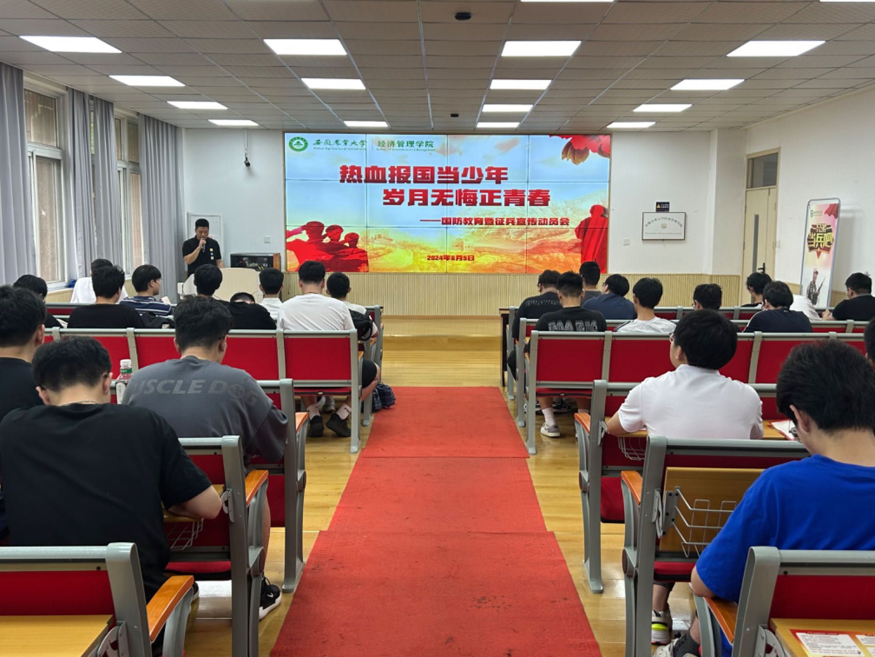 本网讯 为做好2024年下半年征兵工作,大力营造征兵浓厚氛围,激发学院优秀学子携笔从戎、报效国家热情,引导学生参军入伍、建功军营。6月5日,经济管理学院国防教育暨征兵宣传动员会在103报告厅顺利开展,学院2020级、2021级适龄学生参加了此次会议。