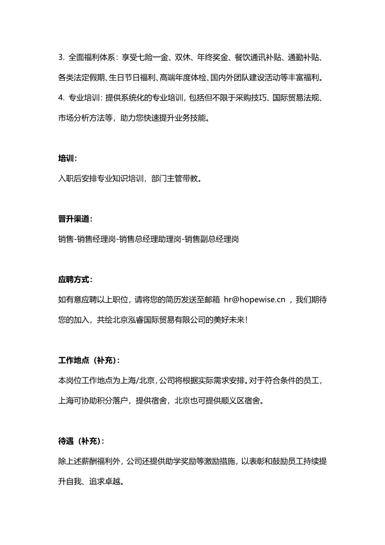 3、职业发展:国内外业务拓展及考察机会,每年一到两次出国考察机会。