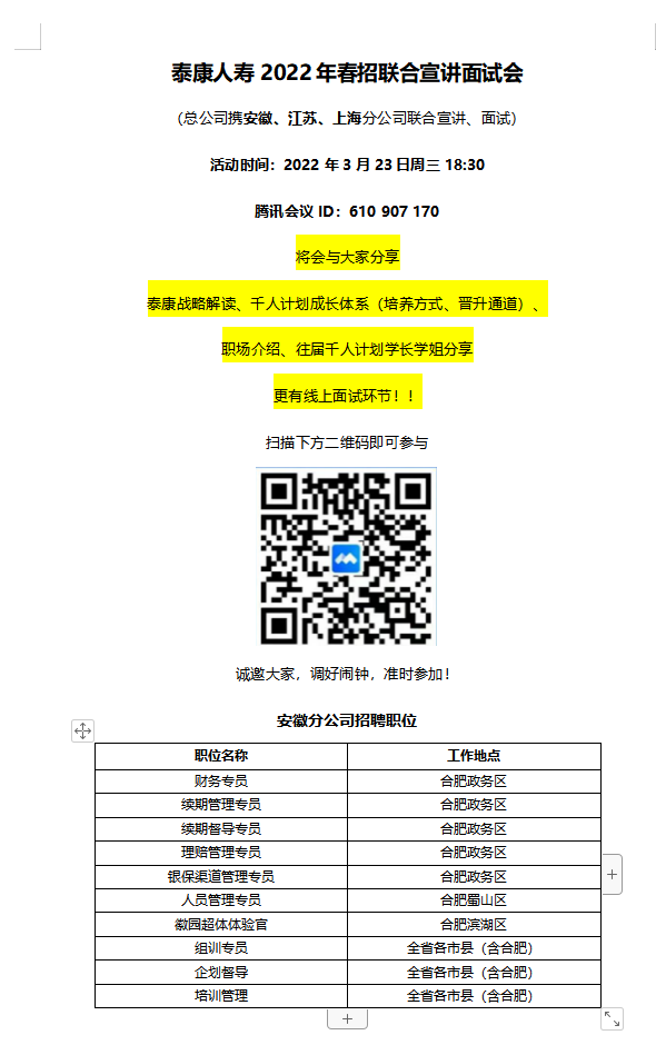 【空中宣讲会】2022年3月23日周三18:30 泰康人寿2022年春招联合宣讲面试会