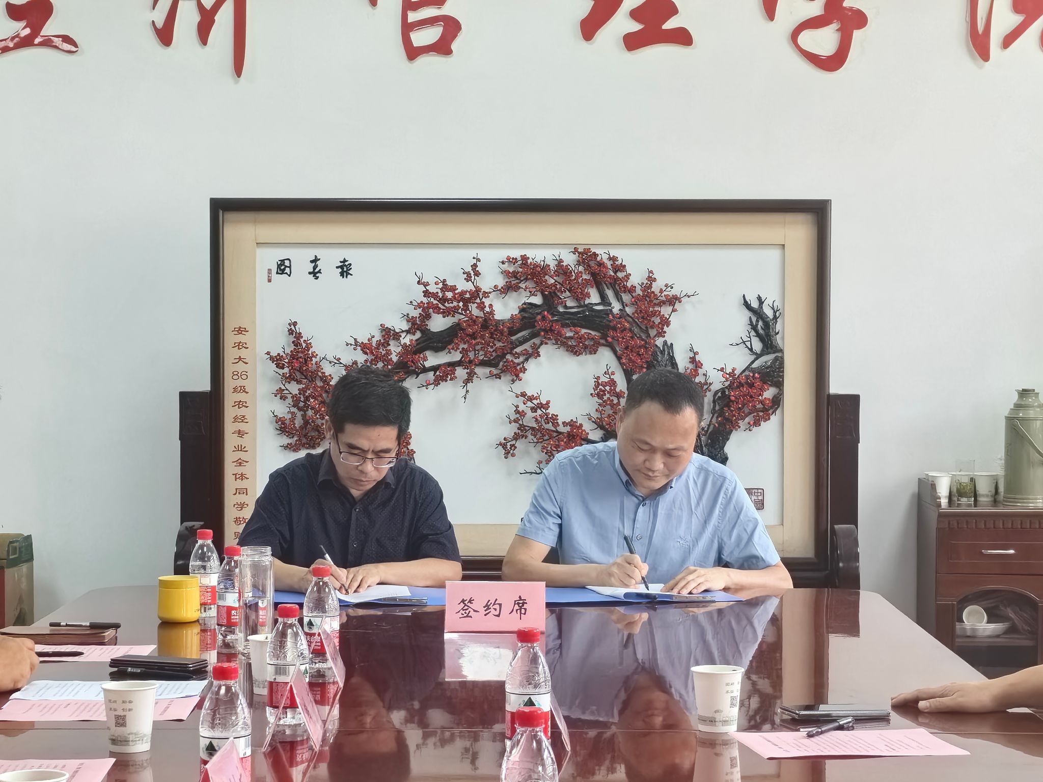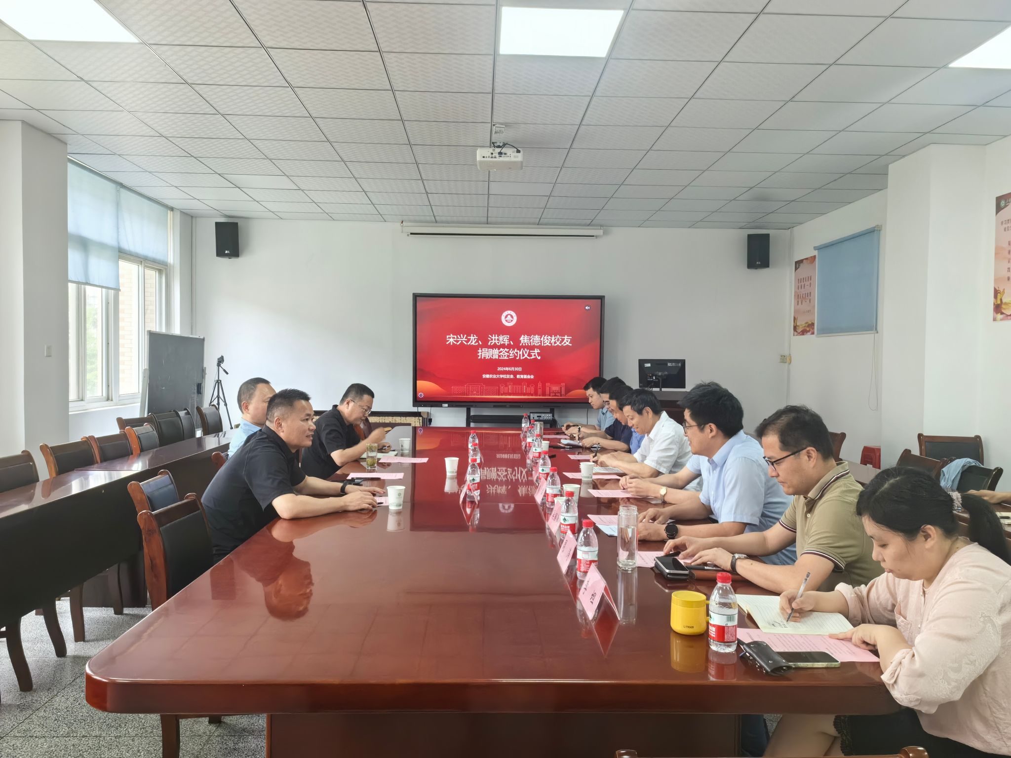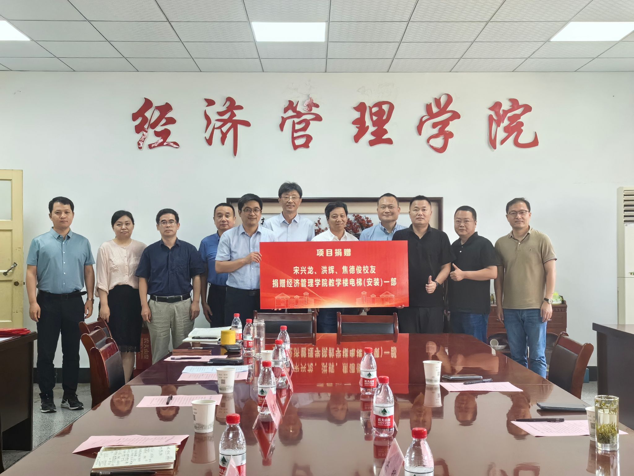 本网讯 饮水思源感念母校,校友捐赠助力发展。6月30日下午,在经管学院304会议室举行了教学楼电梯(安装)捐赠签约仪式,这也是学院教学楼的第一部电梯。校教育基金会理事长裴树东,校友会副会长韩军,校友会办公室主任、基金会秘书长刘海涛,学院党政领导班子,2002届农林经济管理专业校友、上海悦扬环保科技发展有限公司董事长宋兴龙,2002届农林经济管理专业校友、上海商吉包装有限公司、安徽商吉包装有限公司董事长洪辉,2002届土地规划与利用专业校友、上海诚联实业(集团)有限公司董事长焦德俊出席了仪式。此次捐赠仪式由学院党委书记、校友分会会长吴国卿主持。校友会办公室、学院办公室相关负责人及工作人员参加座谈。
