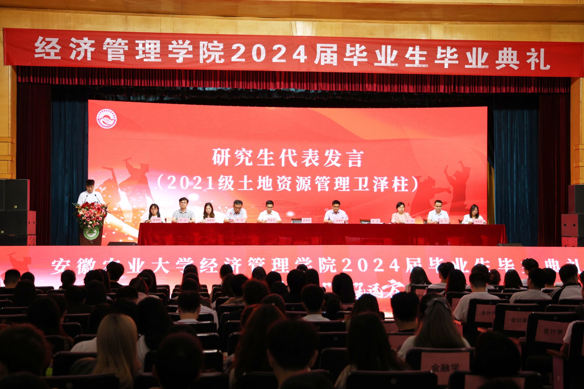 毕业典礼在庄严的国歌声中拉开了帷幕。蔡德军副校长在讲话中对圆满完成学业、即将踏上人生新征程的毕业生致以热烈祝贺,带领师生共同回顾了四年来与祖国大时代同频共振的关键时间节点,寄语毕业生要做初心不改、勤奋笃实、勇于突破的安农人,在推进强国建设、民族复兴伟业中展现青春作为、彰显青春风采、贡献青春力量,奋力书写为中国式现代化挺膺担当的青春篇章。