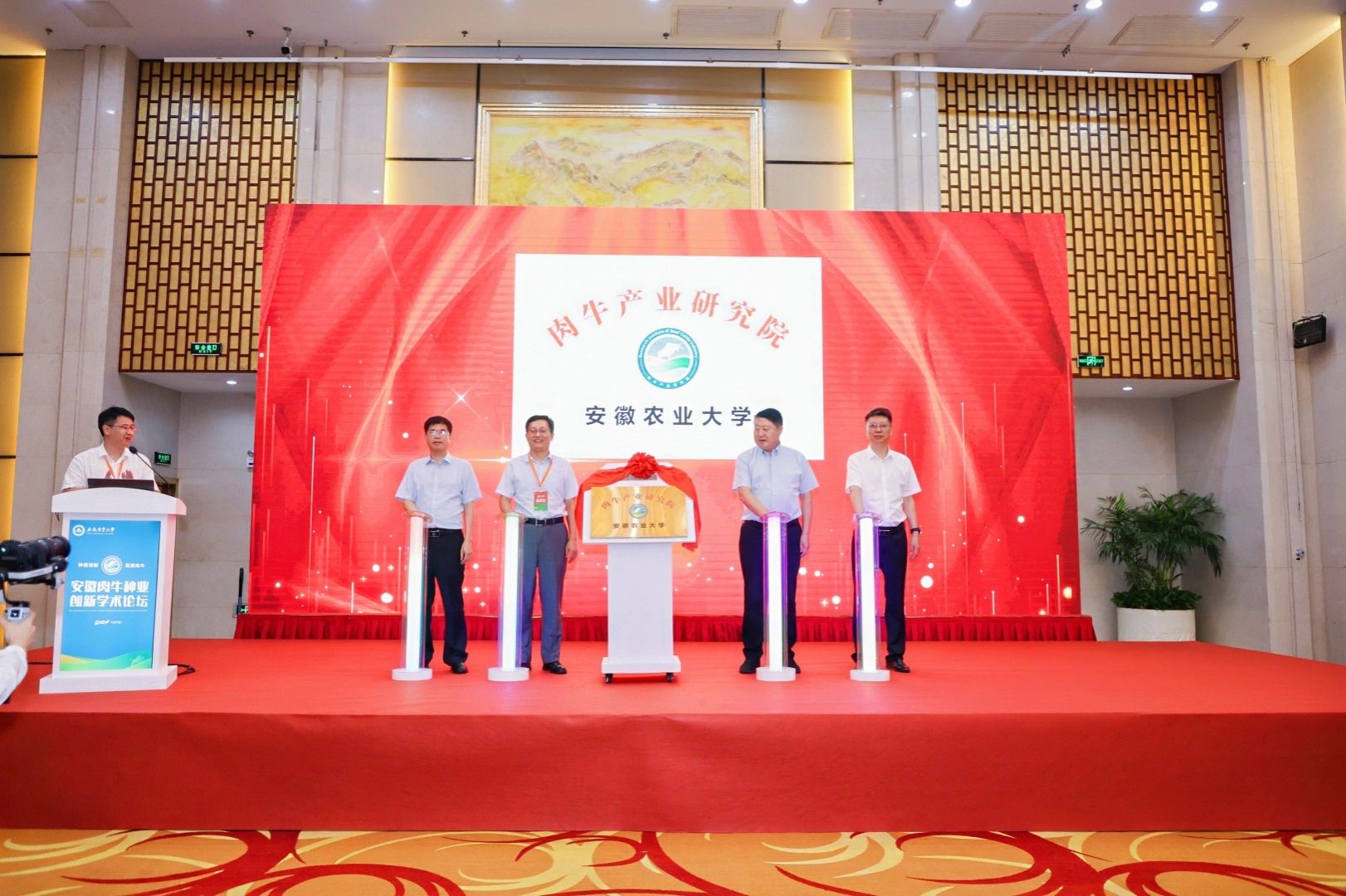 本网讯 8月9日-11日,我校举办安徽省首届肉牛种业创新学术论坛。省教育厅、省农业农村厅、省外办、国家肉牛改良中心等部门的领导和专家,以及省内外肉牛产业链企业代表,学校相关职能处室及学院负责同志、师生代表等约200余人参加了论坛。开幕式上进行了“肉牛产业研究院”揭牌仪式和研究院学术委员会委员聘书颁发仪式。