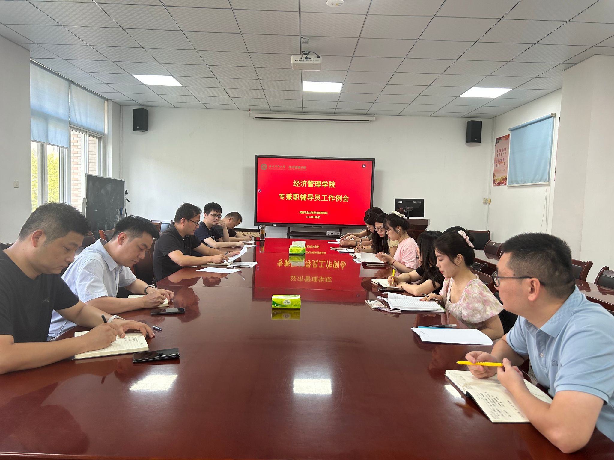 本网讯 9月4日下午,经济管理学院新学期辅导员工作学习会在学院304会议室召开。学院全体专兼职辅导员参加会议,会议由学院党委副书记周涛主持。