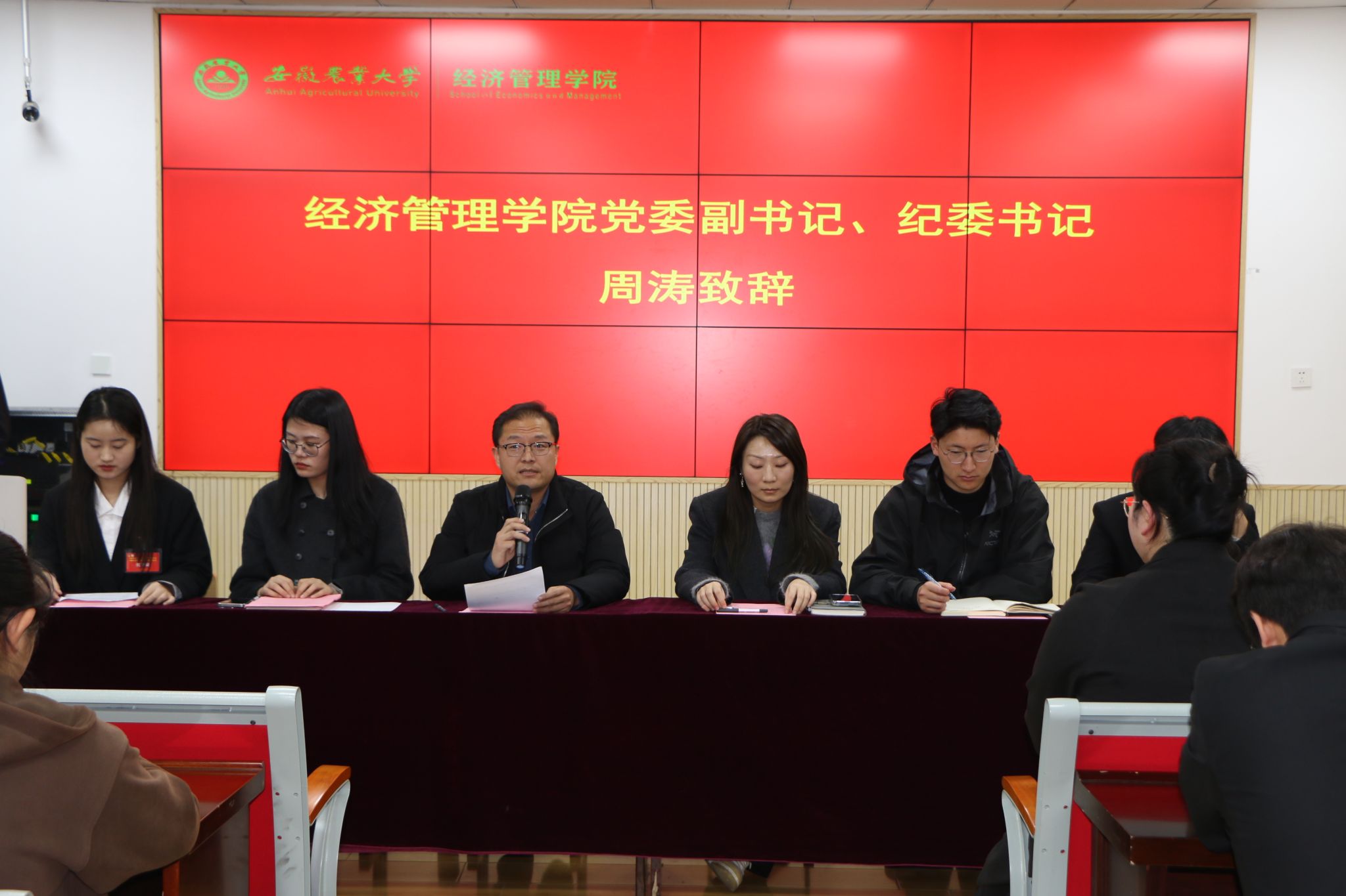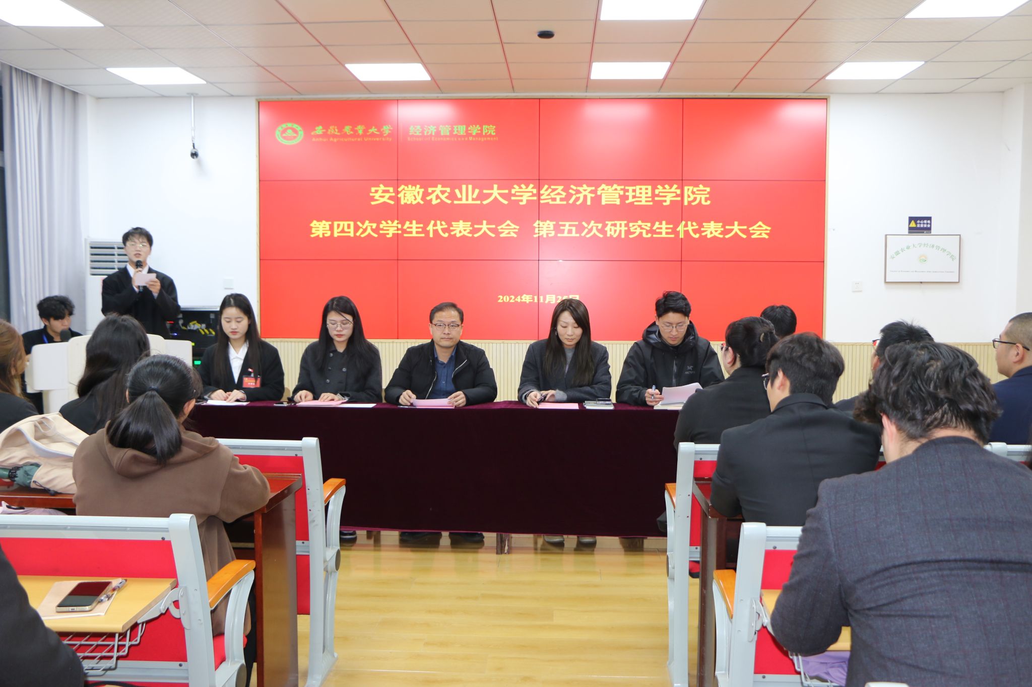 本网讯 11月25日晚,经济管理学院第四次学生代表大会、第五次研究生代表大会在经管楼103召开。学院党委副书记、纪委书记周涛出席会议并致辞,学院团委老师、研究生会指导老师以及全院89名本科生代表、12名研究生代表参加会议。