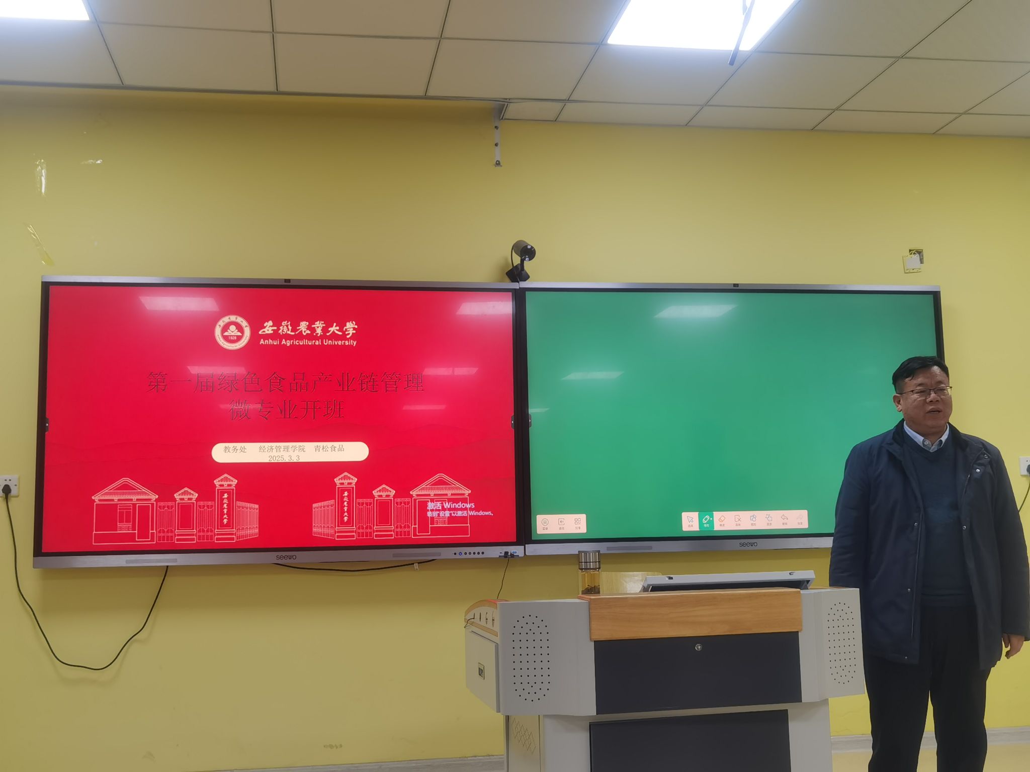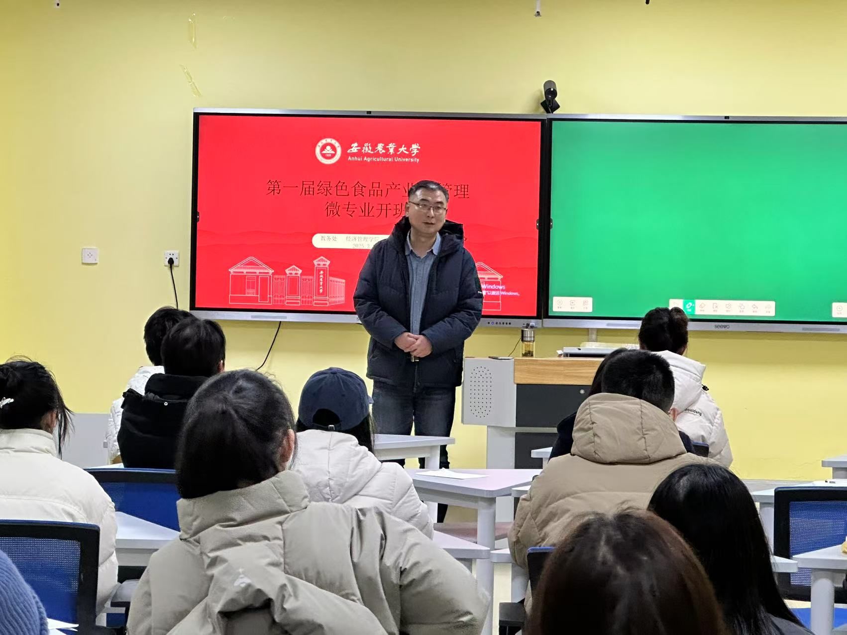 本网讯 3月3日,安徽农业大学经济管理学院102教室气氛热烈,备受期待的食品产业链管理微专业开班仪式顺利举行。青松食品公司人事部经理查艳红,学校教务处处长江海洋,经济管理学院专业教师代表肖双喜、《绿色食品产业链管理》微专业第一届全体同学参加开班仪式。仪式活动由经济管理学院副院长田涛主持。