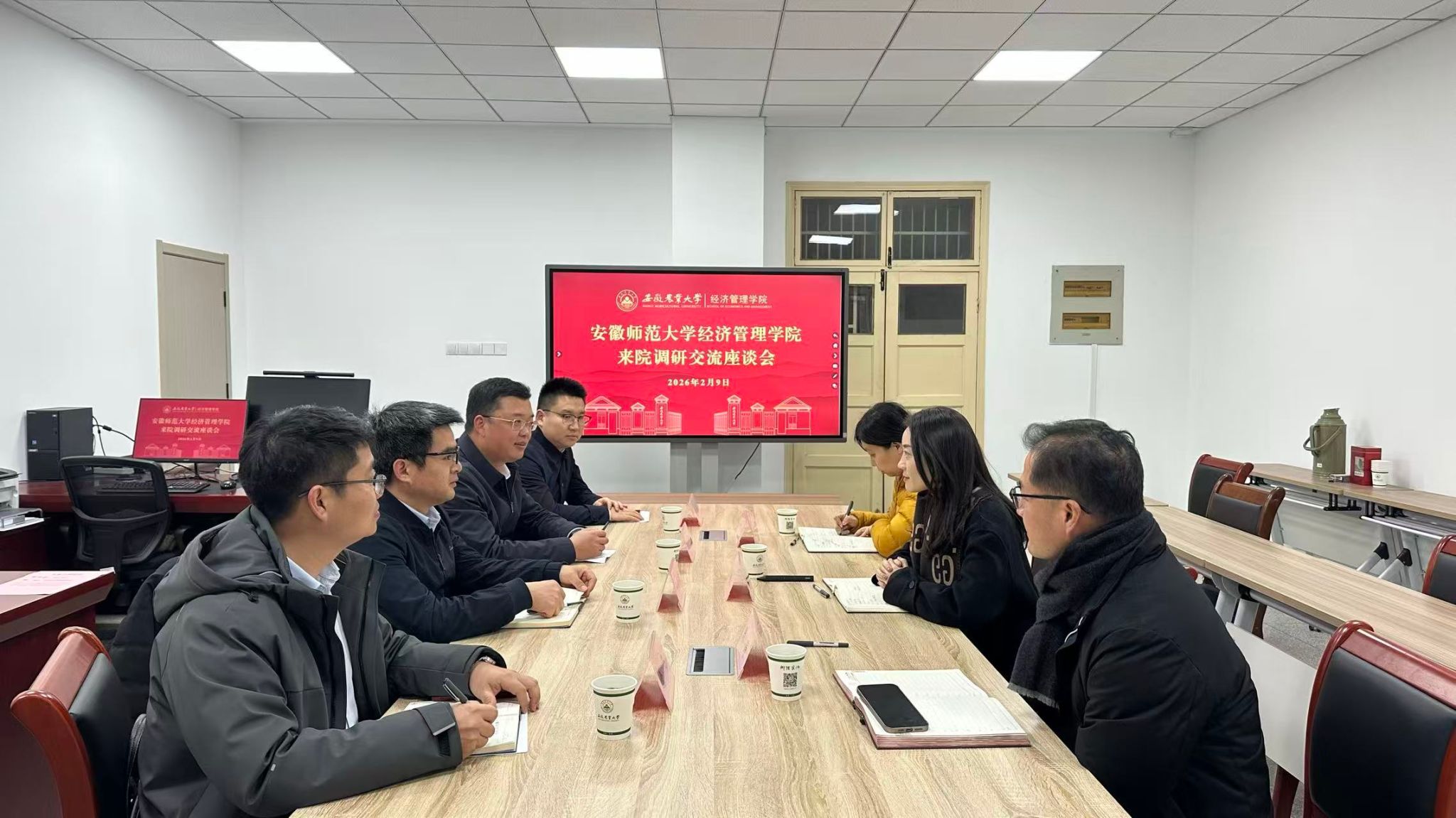 本网讯 2月9日,安徽师范大学经济管理学院院长马长伟、副书记(主持党委工作)孙良林、副院长徐飞、副院长孔敏来院调研交流。我院党委书记武晓蓓、党委副书记、纪委书记周涛、副院长李坦参加座谈会,会议由武晓蓓主持。