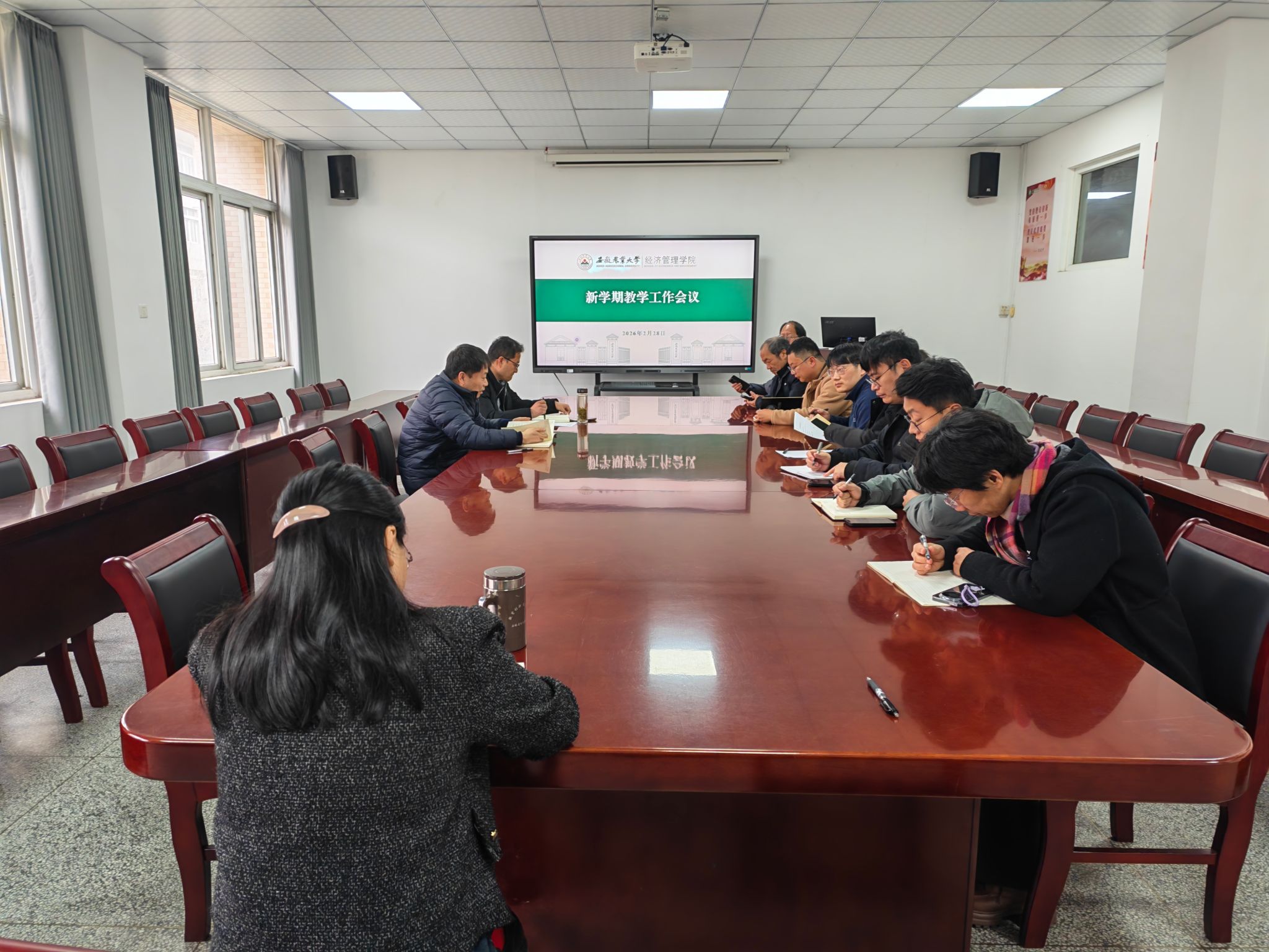 本网讯 2月28日下午,经济管理学院在经管楼304会议室召开新学期教学工作会议,全面部署新学期教学工作任务。院长杨波主持会议,院党委副书记、纪委书记周涛、各系主任、教学秘书等参会。