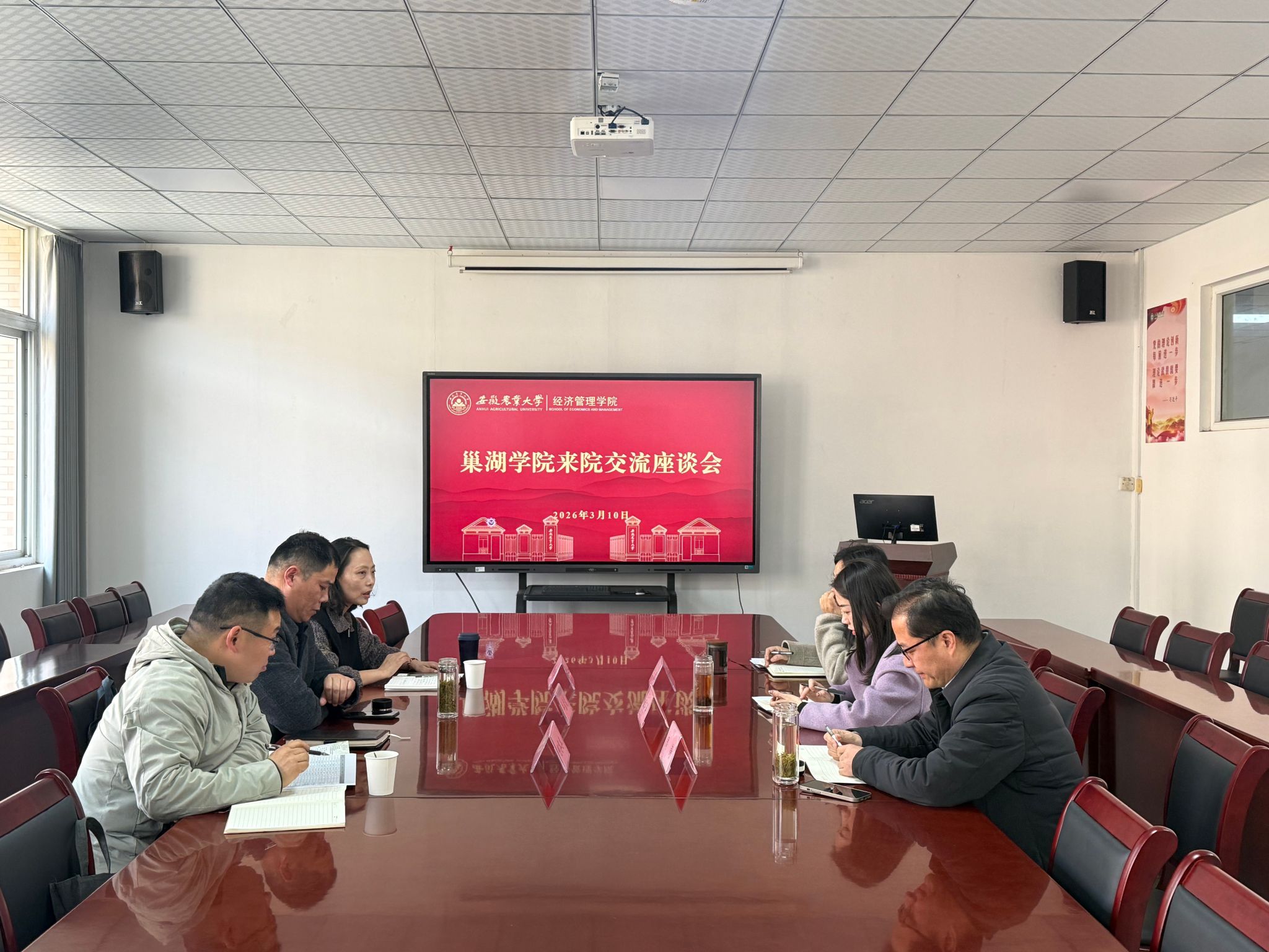 本网讯 为加强校际合作,抓实人才培养重点工作,3月10日,巢湖学院党委学生工作部部长华紫武,经济与法学学院党委副书记、纪委书记解雪梅,工商管理学院党委副书记何冬冬来院交流座谈。我院党委书记武晓蓓,党委副书记、纪委书记周涛,副院长李坦参加座谈会,会议由武晓蓓主持。
