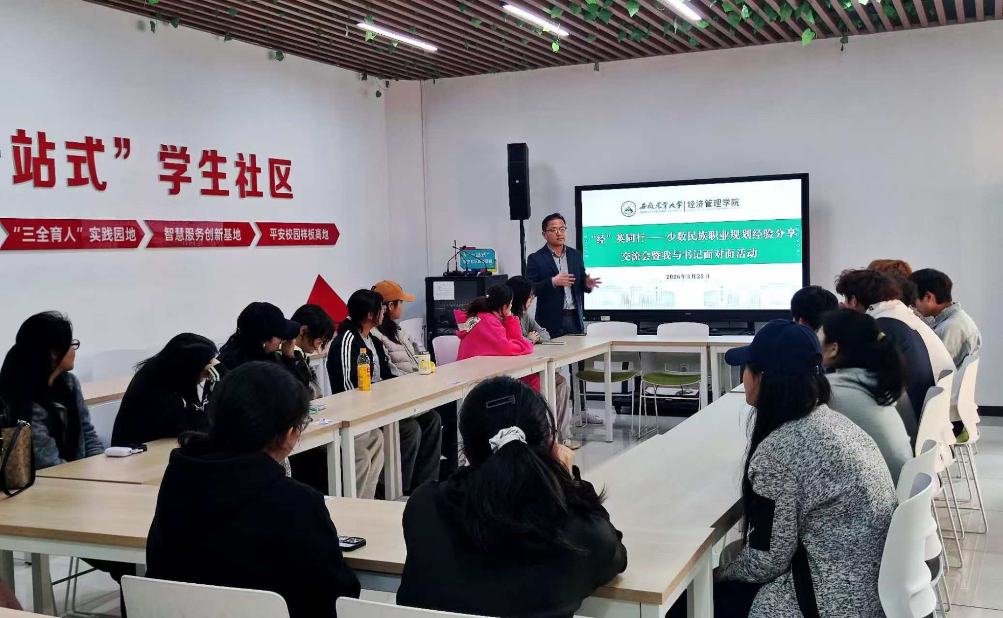 3月25日下午,学院在“一站式”学生社区北区举办少数民族职业规划经验分享交流会暨我与书记面对面活动,藏族学生代表参加。学院负责老师围绕藏族学生的就业渠道、西部计划、校友榜样、自主创业等方面进行交流,为在场同学提供了务实可鉴的成长路径。分享内容贴近实际、干货满满,引发热烈共鸣。会后,学院党委副书记、纪委书记周涛与少数民族学生围坐交流,认真听取同学们在学习生活、职业规划、校园适应等方面的困惑与建议,并逐一回应,鼓励同学们坚定理想信念,铸牢中华民族共同体意识,珍惜学习时光,练就过硬本领,将个人成长融入国家发展,在实现中华民族伟大复兴的征程上书写青春华章。