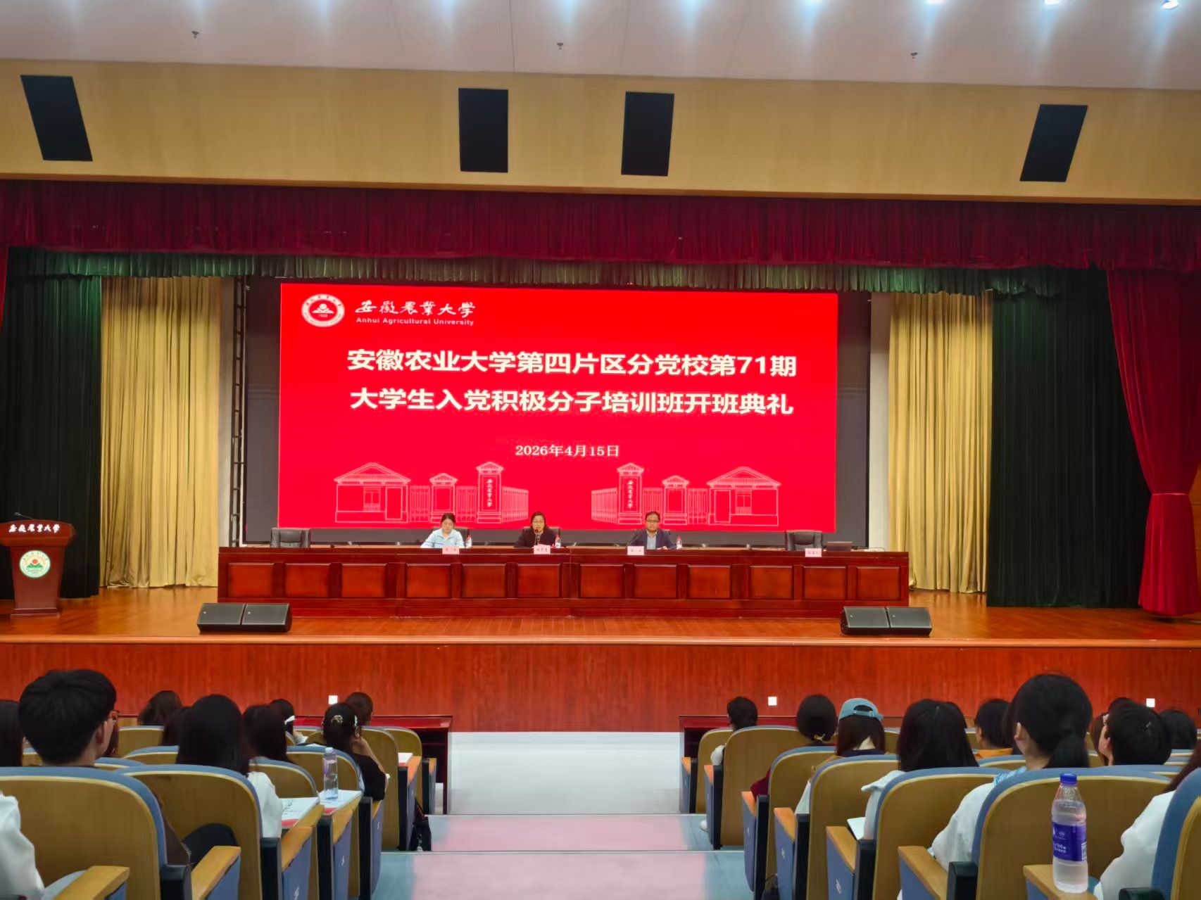 本网讯 4月15日晚,安徽农业大学第四片区分党校第71期大学生入党积极分子培训班开班典礼在图书馆第一报告厅举行。外国语学院党委副书记、纪委书记姬惠惠,人文社会科学学院党委副书记、纪委书记龙杰出席会议,第四片区分党校全体学员和班主任参加了本次开班典礼。开班典礼由经济管理学院党委副书记、纪委书记周涛主持。