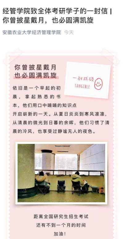 走访过程中,学院领导与同学们亲切交流,详细询问了大家复习备考的相关情况,并鼓励同学们要合理安排作息,注意劳逸结合,高效复习;要坚定信心,放松心态,以饱满的精神状态做好最后的冲刺,在考试中取得理想的成绩。同时,学院始终坚持以学生为中心,不断完善服务保障,全力为考研学生保驾护航。此外,我院还专门发布了《致全体考研学子的一封信》,勉励同学们坚定信念、努力奋斗,以昂扬的精神状态早日实现自己的人生理想。