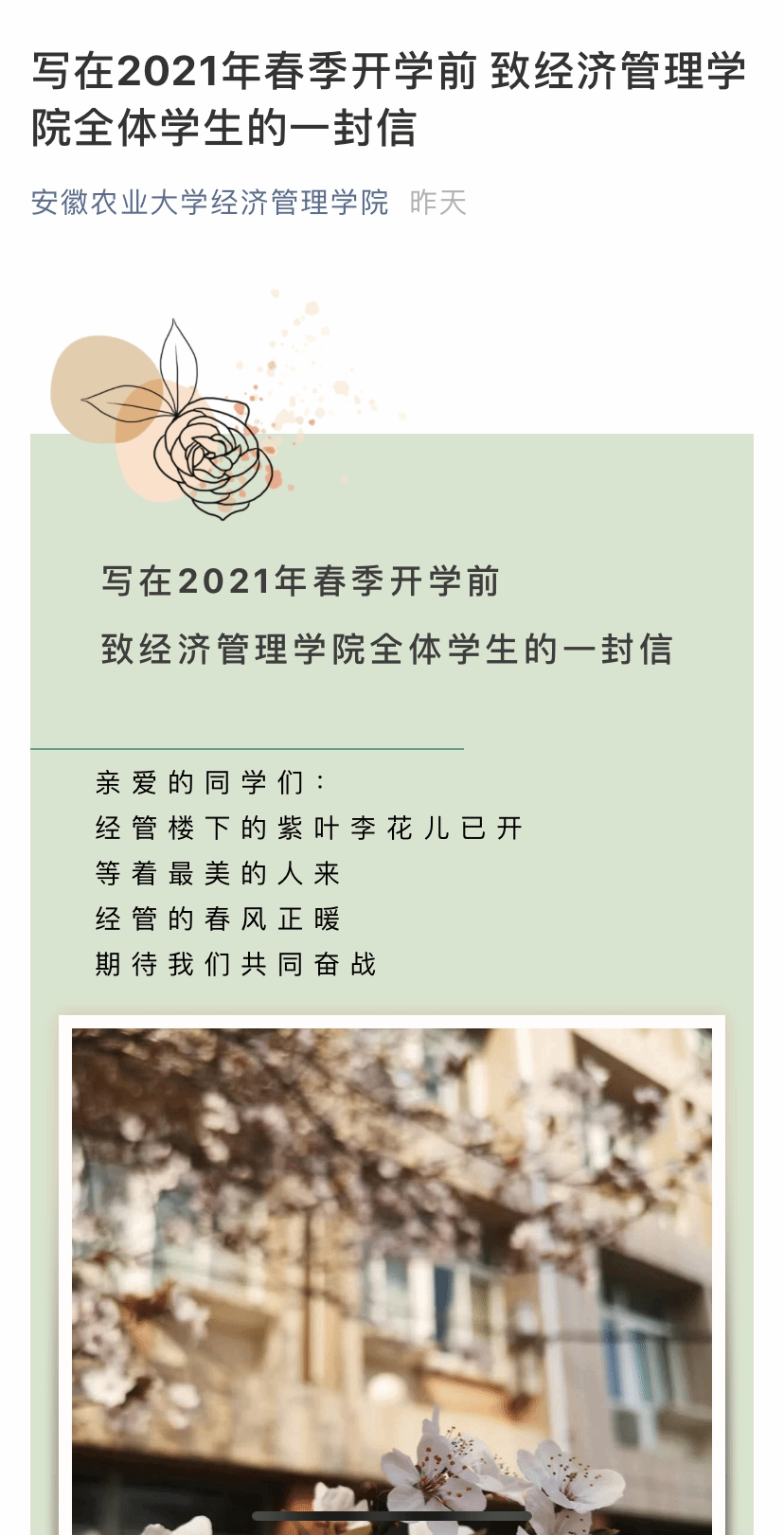 相关老师也就近期就业、团学等日常工作进行了安排。此外,学院还专门发布了《写在2021年春季开学前 致经济管理学院全体学生的一封信》 ,期望同学们能够发扬新时代的“三牛精神”,以只争朝夕的拼劲、不负韶华的闯劲,相约经管,续写2021新篇章。