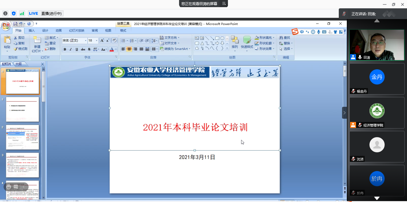 本网讯 为适应高质量发展要求,进一步规范2021届本科毕业生论文写作,3月11日晚,学院通过腾讯会议和腾讯直播召开了2021年本科毕业论文培训会议,副院长田涛主持。各专业负责人、毕业论文导师和2021届本科毕业生近600人参加了线上培训。
