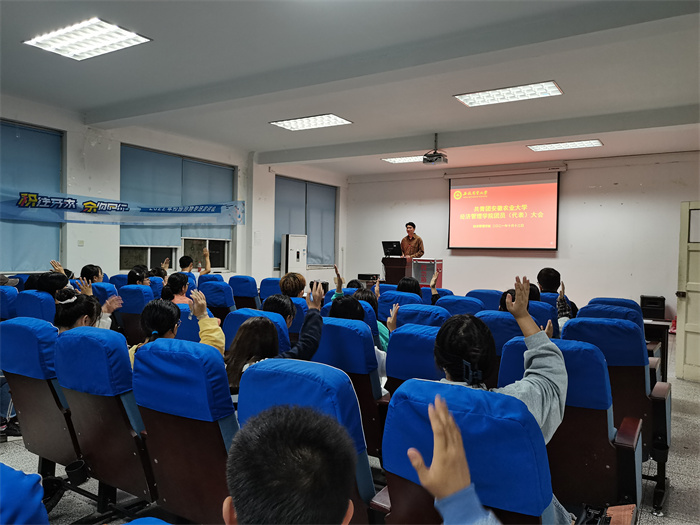 本网讯 10月13日晚,经济管理学院在经管楼317召开了经济管理学院团员代表大会。会议内容是选举产生学院出席校第十二次团代会代表。学院团委老师以及51名团支部团员代表参加了会议。