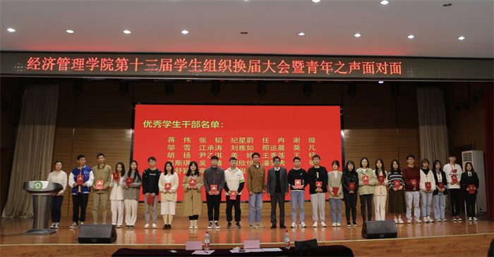 会上,葛伦伟宣读了第十三届学生组织全委名单、二级支队队长名单和《关于表彰经济管理学院学生组织“优秀学生干部”的决定》,与会老师为获得“优秀学生干部”的同学颁奖。