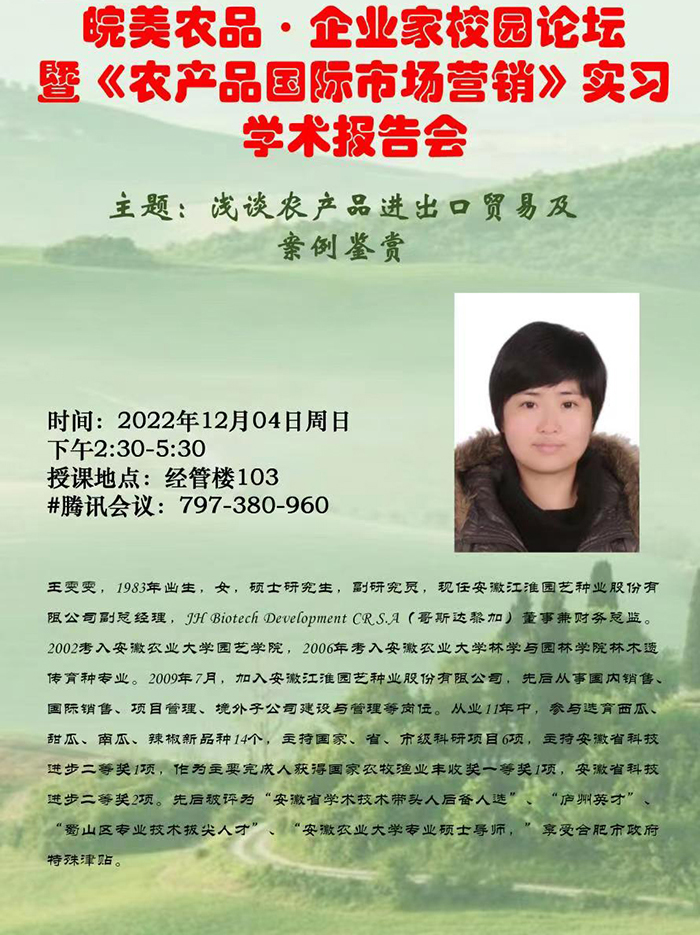 本网讯 12月4日下午,“皖美农品”企业家校园论坛暨《农产品国际市场营销》实习学术报告会在经管楼103举行。安徽江淮园艺股份有限公司副总经理,JH Biotech Development CRSA(哥斯达黎加)董事兼财务总监王雯雯女士受邀在线上开展实习学术报告会讲座。经济管理学院副院长田涛,农业经济学系、商务管理系师生通过线上线下结合的方式参加了此次报告会。