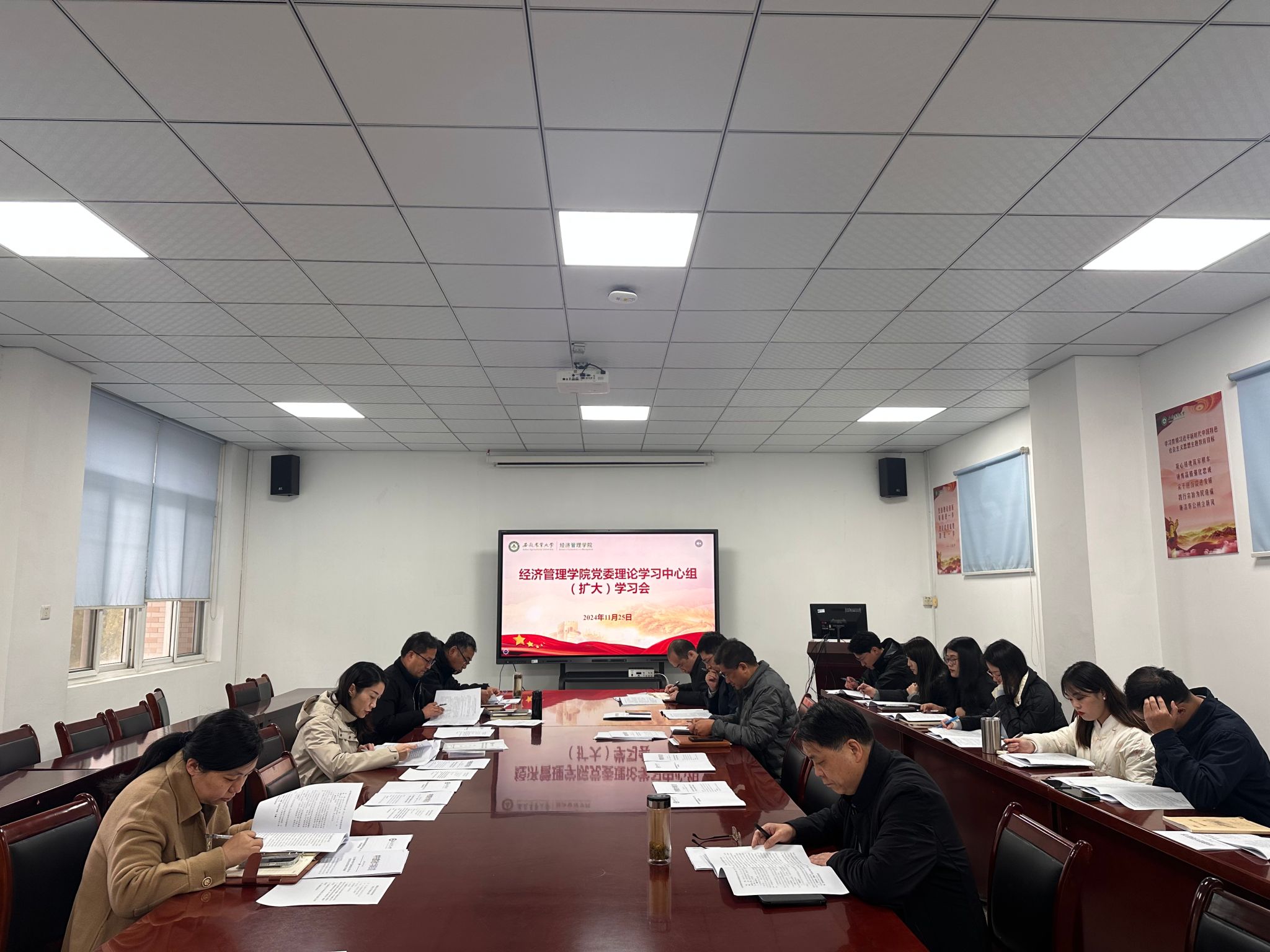 本网讯 11月25日下午,经济管理学院在经管楼304会议室召开党委理论学习中心组(扩大)学习会。学院领导班子、党委委员、党支部书记参加了本次会议。会议由学院党委书记武晓蓓主持。