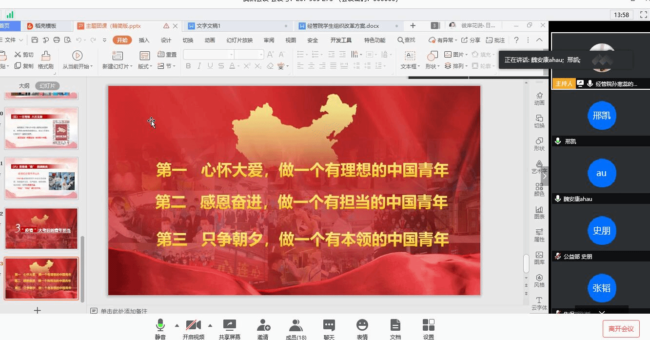 4月29日晚,学院组织“青马班”学员和主要学生干部代表,开展《战“疫”中的中国制度和中国精神》主题团课宣讲,活动由学院团委老师主持。通过回顾疫情防控的进展,引导学员认识到中国国家制度与治理体系中“坚持全国一盘棋,调动各方面积极性,集中力量办大事”的显著优势,坚定制度自信。希望他们争做心怀大爱,有理想的爱国青年;只争朝夕,有本领的实干青年;感恩奋进,有担当的有为青年。