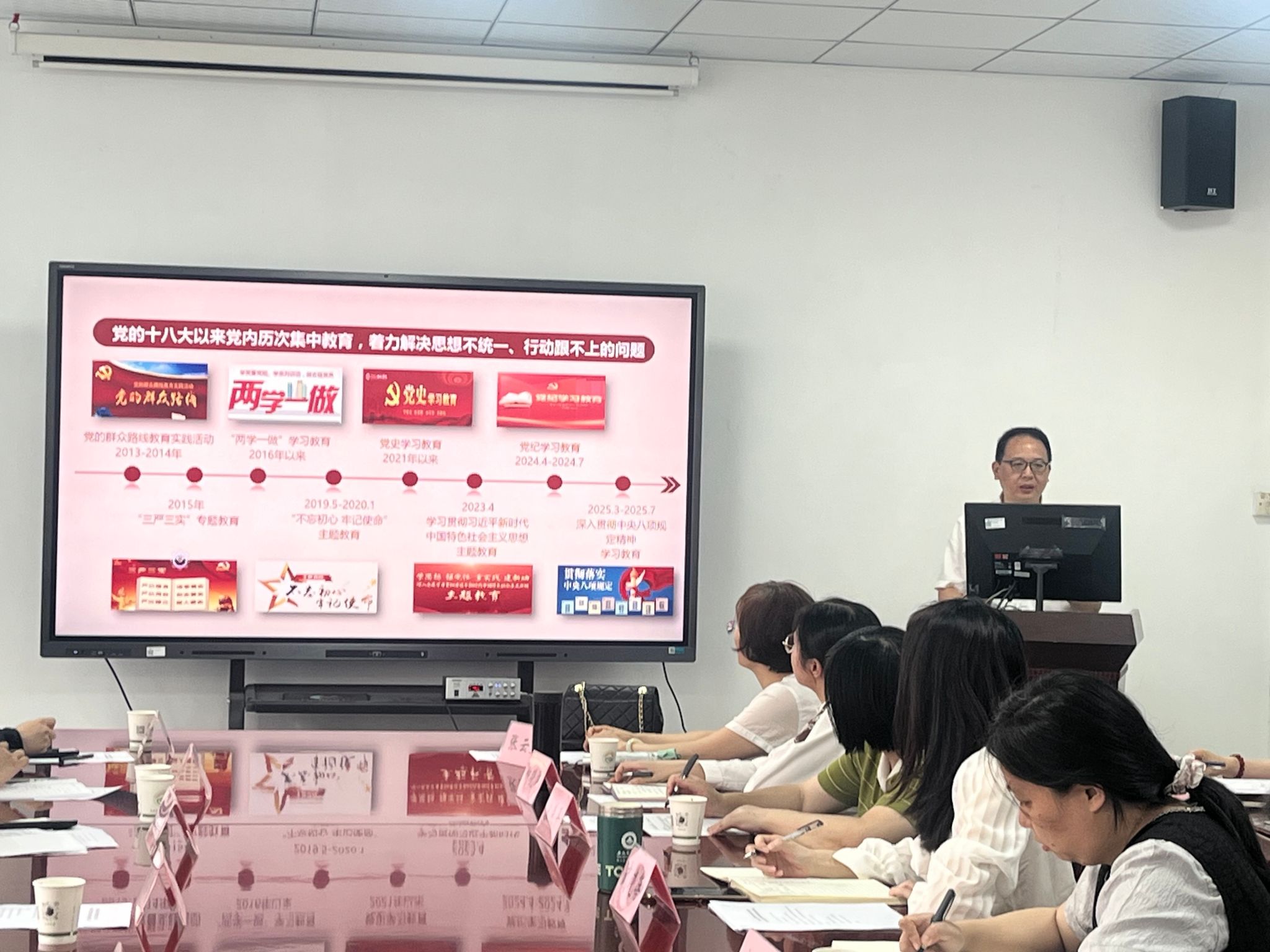 陈黎卿结合党的十八大以来党内历次集中教育,回溯作风建设贯穿中国共产党的发展历程,并以违规吃喝、公款旅游等警示案例敲响纪律警钟,为支部党员讲授了“深入贯彻落实中央八项规定精神、筑牢党的作风根基”专题党课。他强调,要在理论学习中筑牢根基,在实践历练中增长才干,在时代浪潮中勇立潮头;要自觉接受群众监督,虚心接受批评意见,不断改进工作和作风;要充分认识这次学习教育的重要意义,做到锲而不舍贯彻中央八项规定精神,以作风建设新成效推动保持党的先进性纯洁性,一体推进党风政风、师德师风、校风学风建设,为服务支撑教育强国建设提供有力保障。