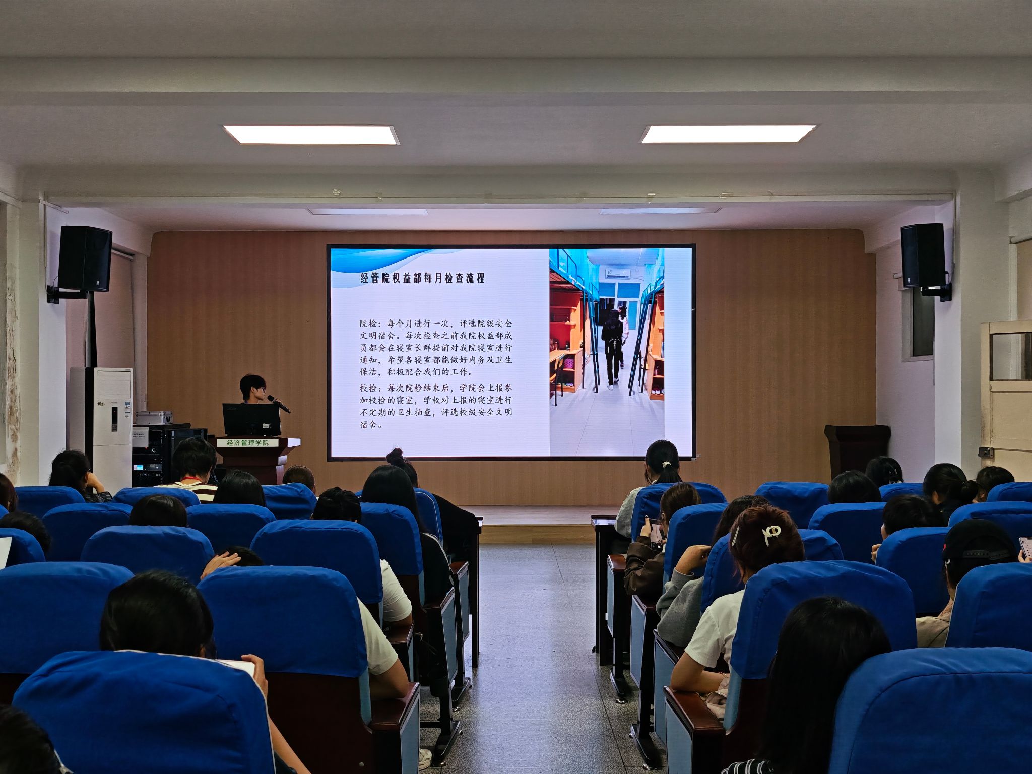会上,权益部干事详细介绍权益部的主要职责、寝室矛盾防范与处理办法、寝室星级评定标准及相关奖惩制度、寝室卫生评比细则及寝室长主要工作职责。此外,会议还重点介绍权益部的传统活动“寝室风采大赛”,为新生寝室长展示以往优秀寝室的风采范例,鼓励大家带领室友们共同装扮寝室、营造舒适环境、建设寝室文化,携手共进秀出青春色彩。