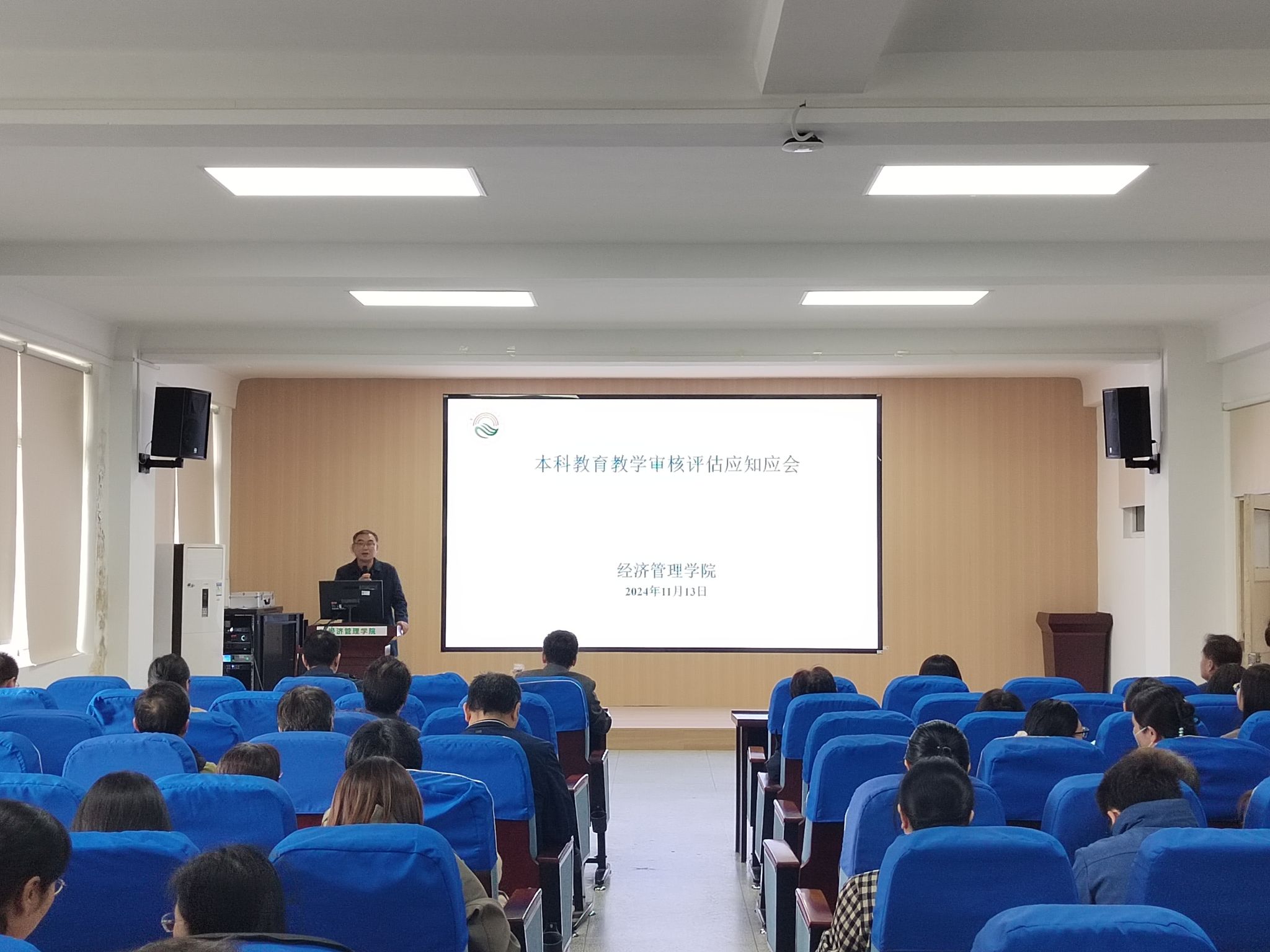 会议就本科教育教学审核评估工作进行了再推进、再部署。副院长田涛围绕“本科教育教学审核评估时间和标准”“新一轮审核评估等热词释义”“学校理念识别系统宣传”“学院发展沿革”等,给全体教职工进行了再培训、再学习。