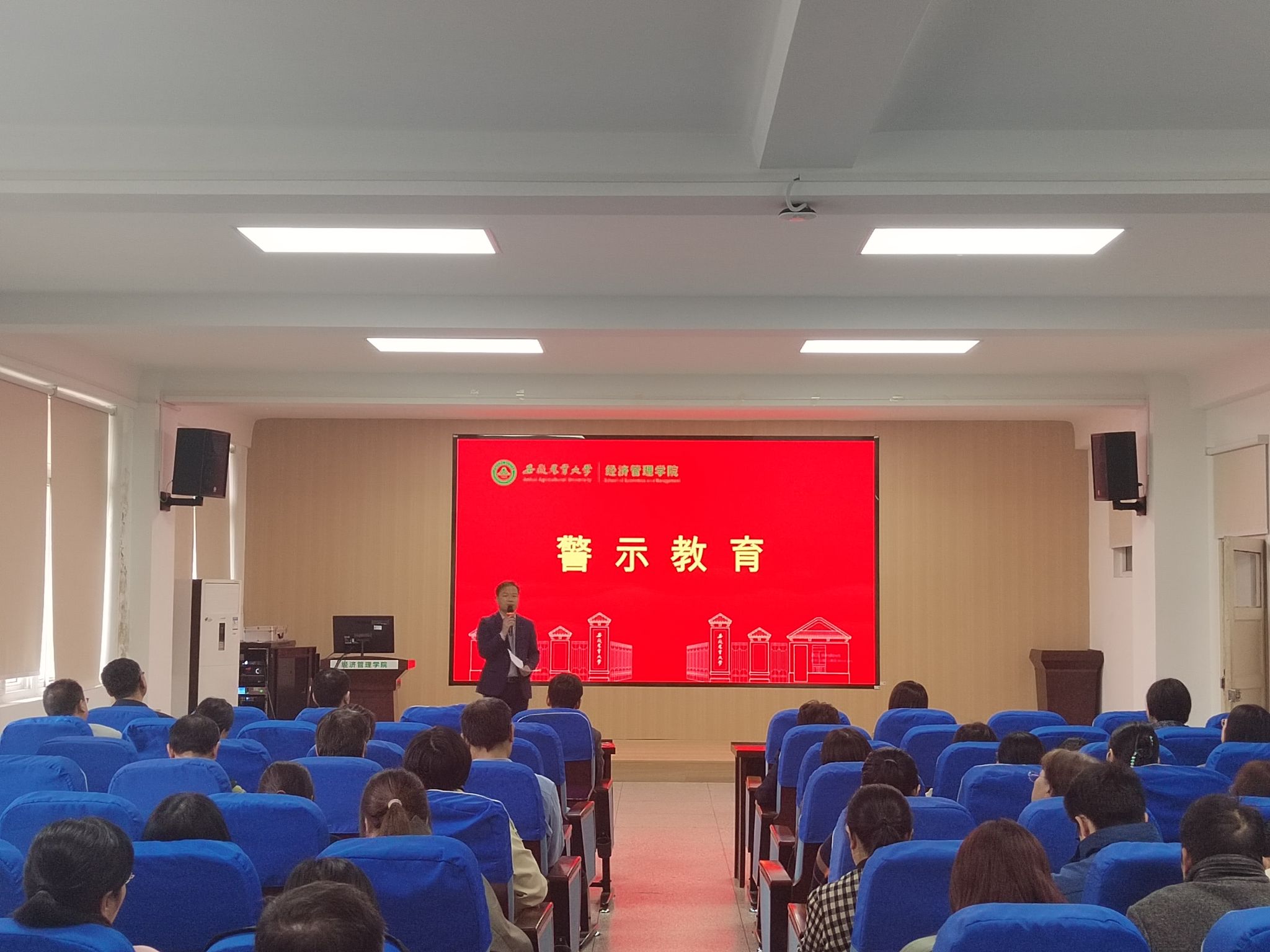 院党委副书记、纪委书记周涛结合近期学校通报的案例向全体教职工开展了警示教育。副院长耿鹏鹏就国家“三大项目”申报工作进行了通报推进,并就教职工参加学术会议政策等进行了说明。