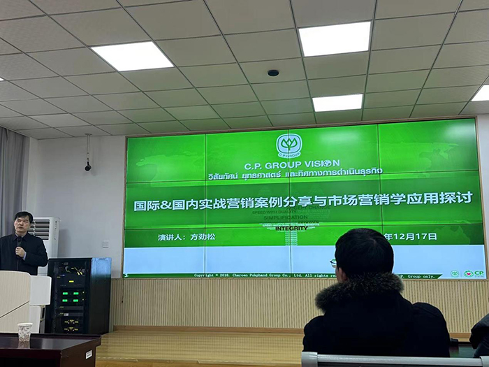 12月17日,正大集团安徽区副总裁方劲松带来了主题为“国际&国内实战营销案例分享与市场营销学探讨”的讲座。他分享了正大集团在国际和国内市场的营销实战案例,并深入探讨了市场营销学的相关知识,为学生提供了宝贵的经验和启示。方劲松强调了市场分析、目标定位、策略制定、执行评估等方面的重要性,为学生未来的职业方向提供了有效参考。