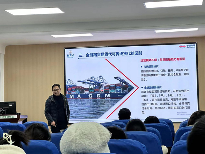 在12月14日的论坛中,中国外运公司企业家首次分享了他们的“全链路业务”。通过深入浅出的方式,结合个人实践经验,详细讲解了国际物流的全过程,包括货物的装运、报关、运输和配送等环节,为学生提供了更全面的视角。学生通过理论学习加深对实际操作的理解,对该行业工作要求和挑战有了更充分的准备。