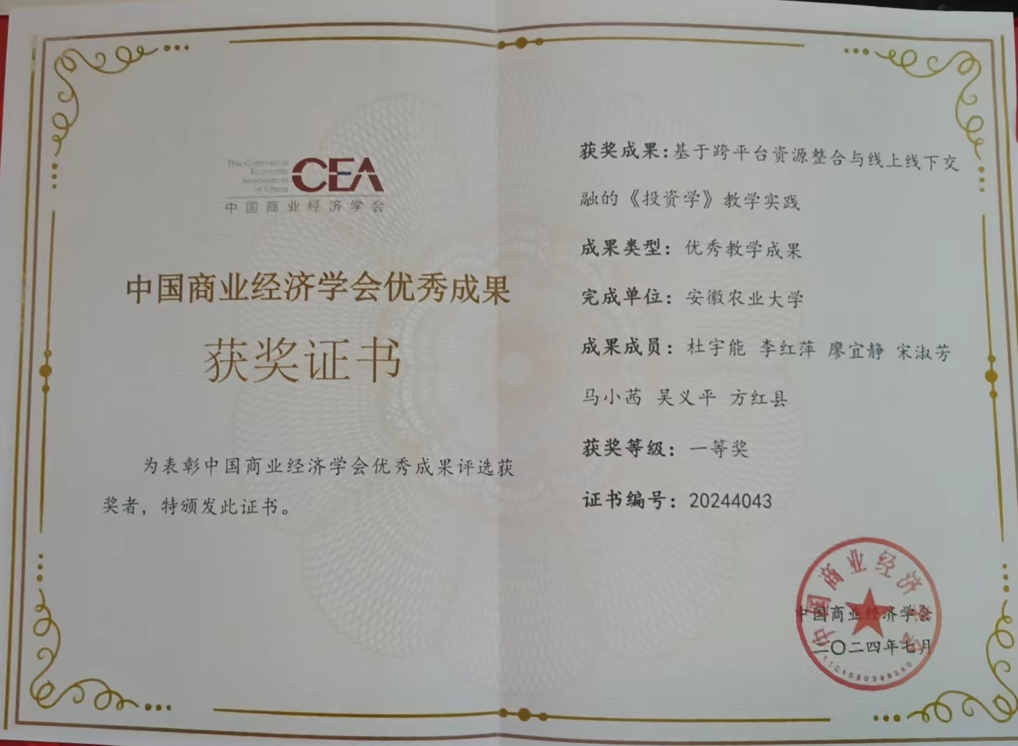 本网讯 近日,由中国商业经济学会组织召开的2024年度新商科教学与学术年会在浙江嘉兴举行。本次年会汇聚了来自全国各地的商科教育精英,共同探讨新商科教学的发展与未来。此次年会上,经济管理学院杜宇能教授领衔的《投资学》课程组教学成果“基于跨平台资源整合与线上线下交融的《投资学》教学实践”荣获中国商业经济学会优秀教学成果一等奖。