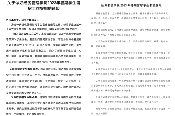 全员参与营造良好氛围。学院结合学校要求和学院实际发布和制定了《关于做好经济管理学院2023年暑期学生留宿工作安排的通知》和《经济管理学院 2023 年暑期留宿学生管理规定》,要求全体专兼职辅导员和研究生导师围绕学生学习生活和安全等,暑期持续走进学生、关爱学生、服务学生,切实加强假期留宿学生的管理和服务工作,在全院营造“围绕学生、关照学生、服务学生”的良好氛围,把主题教育成效和专项行动举措转化为推动学生工作高质量发展的强大动力。